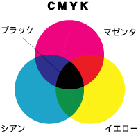 CMYKとは、シアン(=C)、マゼンタ(=M)、イエロー(=Y)の三原色にブラック(=B)を加えたものです。理論上は色材の三原色を重ね合わせるとブラックになるはずなのですが、通常の印刷インクではきれいに出せないためにブラックが入ります。
